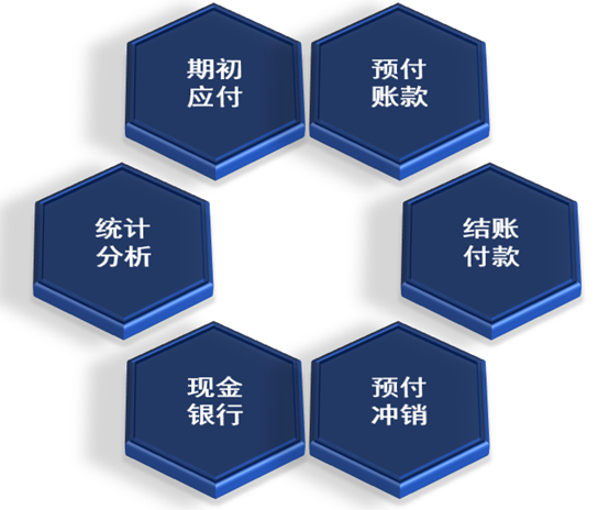 主要包括:應(yīng)付賬款管理、應(yīng)付費用、預(yù)付款管理、對賬管理、付款、壞賬管理、賬戶收支總賬、賬戶收支明細賬,以及應(yīng)付管理相關(guān)的明細報表和統(tǒng)計分析報表及圖表。