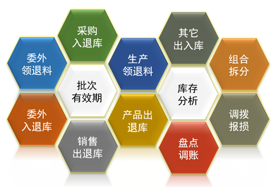 主要包括:采購入庫、采購?fù)素洝a(chǎn)品入(退)庫、庫存調(diào)撥、生產(chǎn)領(lǐng)(退)料、委外領(lǐng)(退)料、委外入庫、發(fā)外退貨、其它入庫、其它出庫、料品組合(折分)、庫存報損、庫存查詢、庫存盤點、庫存調(diào)賬、庫存月結(jié)等功能,提供多倉庫分倉位管理提示控制、呆滯料分析等功能,以及庫存管理相關(guān)的明細報表和統(tǒng)計分析報表及圖表。