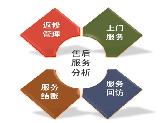主要包括:客服服務(wù),返修登記,返修檢測,維修領(lǐng)退料,維修記錄,維修出貨,維修結(jié)賬,發(fā)出維修,維修返回等功能,以及售后服務(wù)管理相關(guān)的明細報表和統(tǒng)計分析報表及圖表。