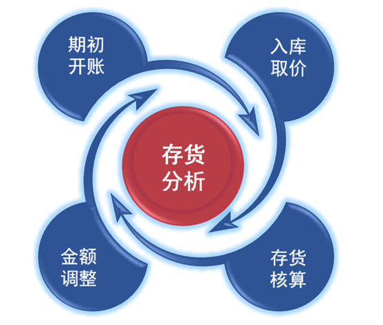主要包括:存貨期初開賬,入庫批量取價,存貨核算,庫存金額調(diào)整,存貨月結(jié),存貨核算查詢以及存貨核算相關(guān)報表。