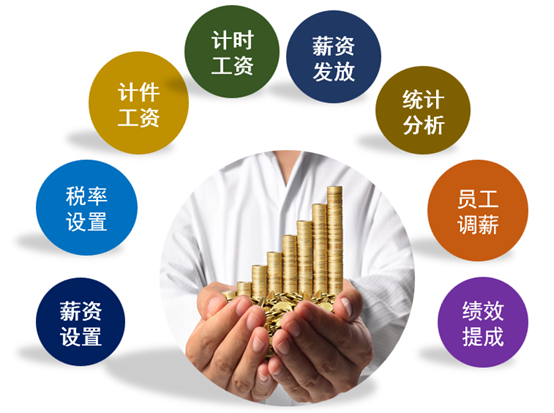 主要包括:薪資項目定義、個人所得稅率定義、薪資期間定義、固定薪資錄入、員工調(diào)薪、變動薪資錄入、考勤數(shù)據(jù)錄入、個人計件數(shù)據(jù)錄入、集體計件數(shù)據(jù)錄入、薪資計算、薪資表、薪資條等管理,以及薪資管理相關(guān)的明細報表和統(tǒng)計分析報表及圖表。