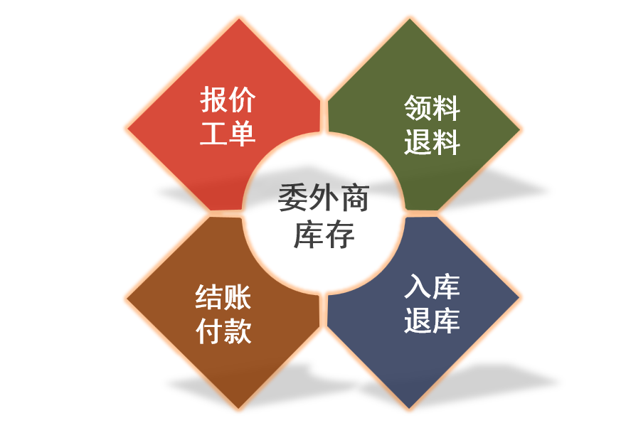 主要包括:委外報價、委外計劃、委外計劃結(jié)案、委外工單、委外工單結(jié)案、委外物料清單生成及控制領(lǐng)發(fā)料、委外發(fā)(退)料管理、委外暫收及委外入庫(退貨)、委外調(diào)價、委外費用、應(yīng)付結(jié)賬管理等功能,以及委外管理相關(guān)的明細報表和統(tǒng)計分析報表及圖表。